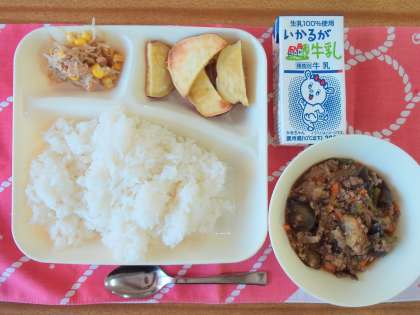 マーボー茄子は、綿実油で豆板醤としょうがを香りよく炒め、牛と豚の合い挽き肉、あく抜きをした茄子、人参、ピーマンが具材で、赤みそ、しょうゆ、塩で味を調え、水溶きでん粉でとろみが付けられています。豆板醤でピリ辛に仕上げてあり、ご飯にピッタリのおかずとなっていました。