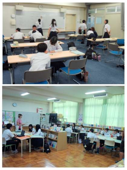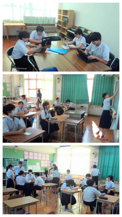 それぞれの委員会では、委員長が中心となり、6月・7月の反省と今月の目標を話し合って決めました。その後、前回同様に、生徒会が準備したクラウド上のシート(Canvaで作成)に話し合った内容を学習者用端末から入力する作業まで行いました。
