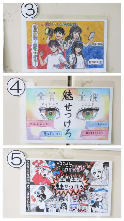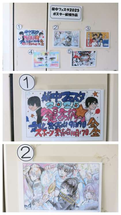 先日の柴中フェスタ実行委員会において、委員会のメンバーが1次選出をした5作品のポスターの候補が1階中央階段に掲示されました。