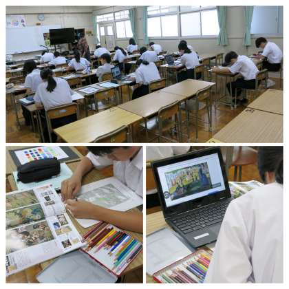 鉛筆で元の「絵」を模写した下書きに、今日は、色鉛筆で彩色をしていました。自身の選んだ「絵」が載っている教科書や資料集のみならず、学習者用端末を用いインターネットで検索した「絵」をピッチして拡大し、細部にわたる色合いや、筆のタッチにも細かく観察して集中して彩色作業を取り組めていました。
