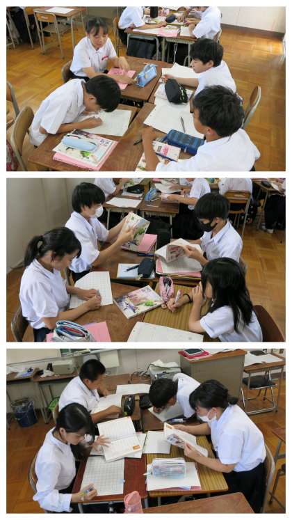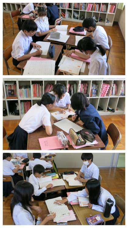 授業の後半では、生徒は3〜4人の班となり「班対抗漢字探し大会」を行いました。先生からの出題、1「月(にくづき)」、2「氵(さんずいへん)」、3「衤(ころもへん)」、4「イ(にんべん)」、5「雨(あめかんむり)の5題についてそれぞれ3分間ずつ、自身の記憶、教科書、他の教科の教科書や資料集などを屈指して、漢字を集めていました。さすがに「衤(ころもへん)」には手こずっていました。