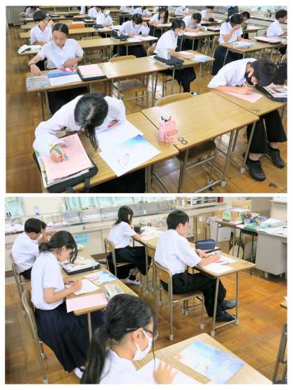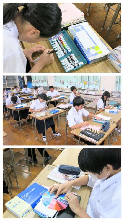 今日の授業の前半は、これから中学校の授業で使用していく「ポスターカラーセット」の筆、絵の具、パレットに1つ1つ名前をネームペンで記入していきました。