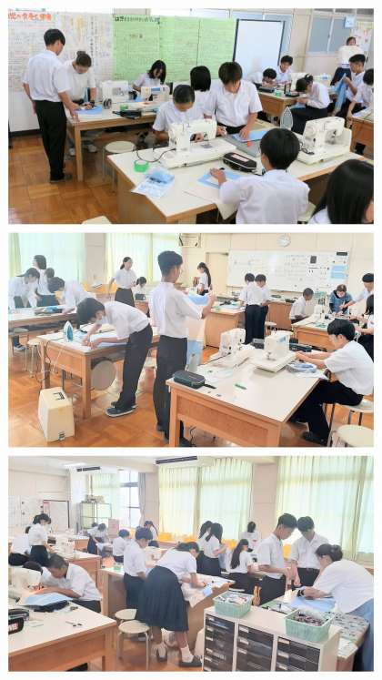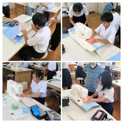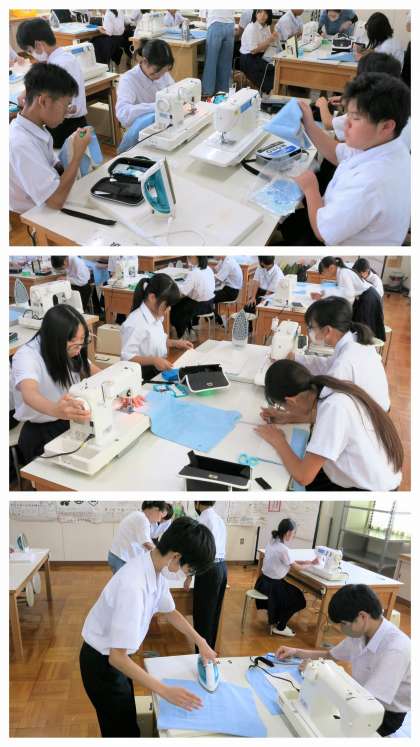「柴中フェスタ・文化発表の部」での展示を目指して、先生からの説明を集中して聞き、アイロンがけ、ミシンがけと作業を手際よく進め、どんどん完成させていました。