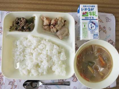 鶏肉の照り焼きは、一口大にカットされた鶏肉に料理酒、砂糖、みりん、しょうゆで下味を付け、焼き上げられていました。照り焼き味が、ごはんのおかずにピッタリです。このおかずも配膳量の2倍は欲しいですね。