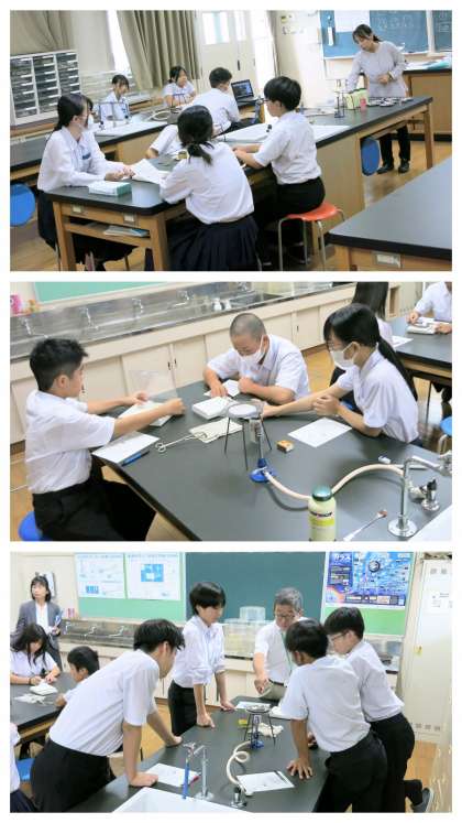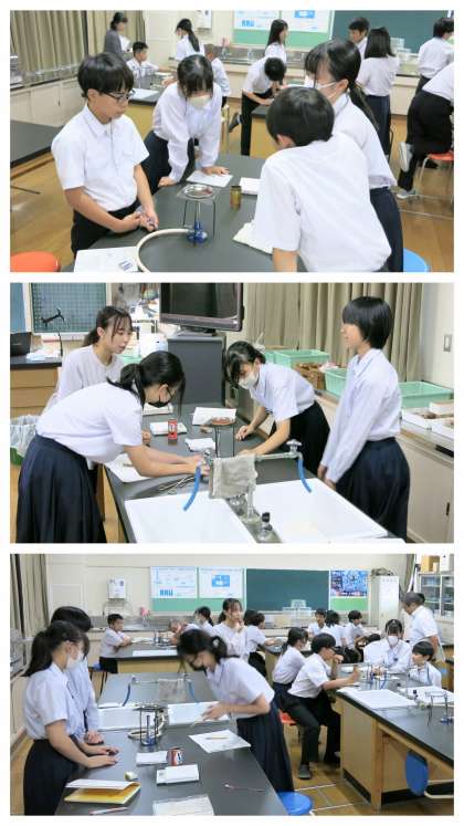 2年生の理科の学習の様子です。前回の授業までで、化学変化の前と後ろでは質量が保たれる「質量保存の法則」を学習しました。今日はその「法則」を確認するための理科室での実験です。