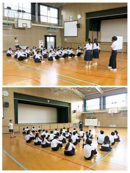 続いて、体育委員会より、「柴中フェスタ・スポーツ発表の部」での学年競技のタイトルと内容が発表されました。団対抗で、リレー方式、人数がどんどん増えていく、いろいろな種目が組み合わさっていく、というような内容でした(今の段階では、HP上での紹介は控えておきます)。さあ、スポーツ発表の部でも、クラスがクラスが一つにまとまり、最上級生として下級生を引っ張っていく、素晴らしい取り組みにしましょう。