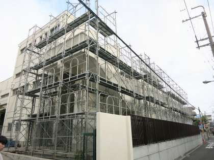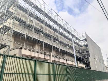 今週の月曜日より始まりました格技室棟の塗装工事ですが、足場がどんどんと組み上げられ、棟の上部にまで及びました。また、半面程は防護シートの設置も終えています
