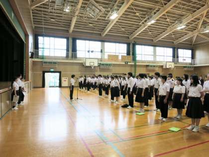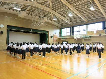 そのような中ですが、今日も8時25分の予鈴には全校生徒が体育館に集合・整列し、全校朝礼がスタートできています。