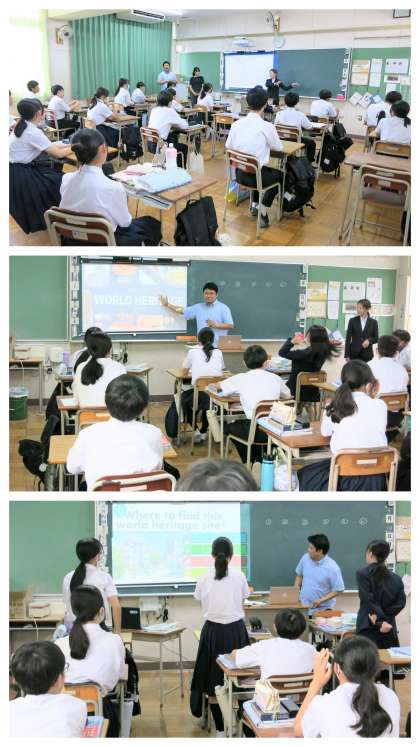 まず、前半は「世界遺産」を題材にして列対抗のクイズ大会でした。「Where to find this world heritage site ?」・「Where can you see this world heritage site ?」と世界遺産の写真が示され、4択の早挙手で答え、正解ならポイントをもらっていきました。