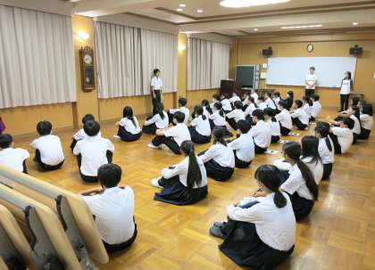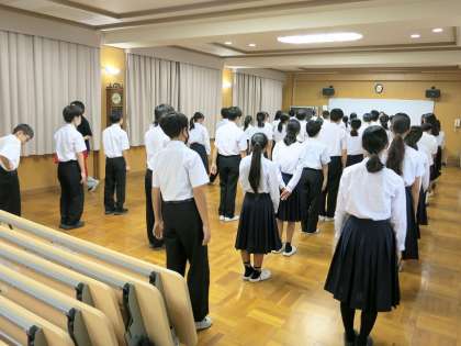 今朝は曇り空で、半袖だと肌寒く感じる登校となりました。金曜日の朝ですので、学年集会です。1年生も多目的室に集合です。