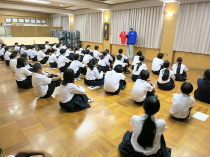 担当の先生からは、1年生にとって初めての「柴中フェスタ・スポーツ発表の部」のお話でした。縦割りの団の全員で取り組む「応援合戦」について、まずは貸し出し用の団カラーのTシャツについての説明がありました。見本を確認して、自分のサイズを申し出てください。ハチマキも貸し出します。