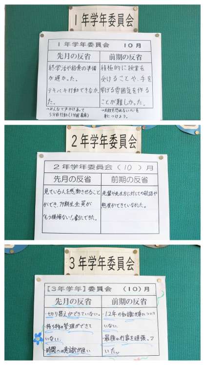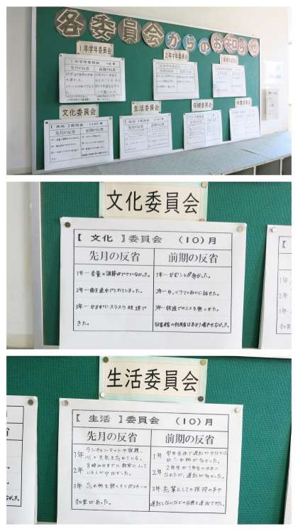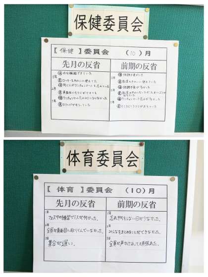 先月の反省と前期の反省について、話し合い、ていねいにまとめられていました。前期の各委員会の皆さん、活動、ご苦労様でした。