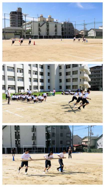 写真は、1年生の学年競技の様子です。1年生は「台風の目」で、小学校の時にも経験があるそうです。3人でバーを持ち、途中のコーンで右回り、左回り、向こう正面で「ハイ・ポーズ」で「決めのポーズ」を取ります。最後は、待っている生徒の足元にバーを通し、最戻る際には、頭上を越して、次の生徒へバトンタッチです。