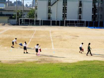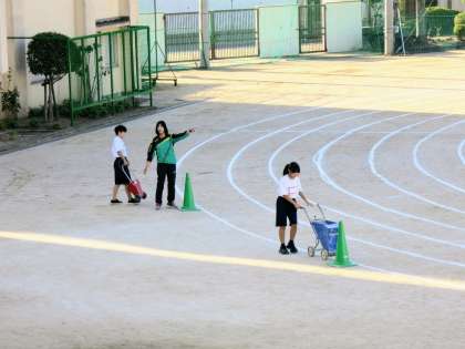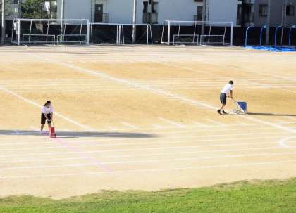 そこで、毎朝、7時30分ごろから体育委員さんが学年交代で登校し、グランドの整備とラインの引き直しを行ってくれています。
