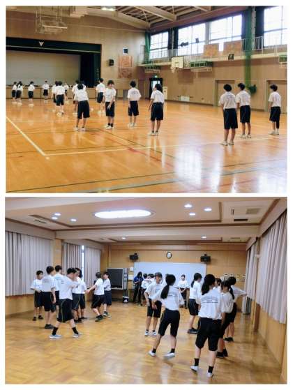 グランドは使わずに体育館での学習となりました。まずは学年全体でスポーツ発表の部の練習を行い、後半は、団(クラス)ごとに体育館と多目的室で、少人数ですが、応援合戦のダンスの総点検・練習を行いました。