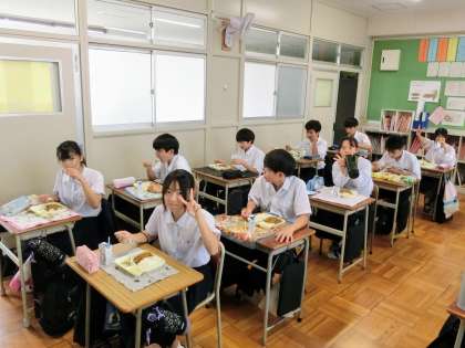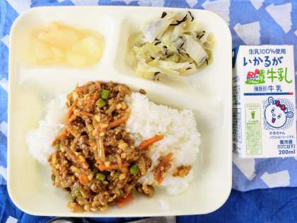 大豆入りキーマカレーライスは、綿実油でニンニクを炒め、香り出しをし、牛と豚の合い挽き肉に加えて豚レバーを炒め、お野菜は主役の大豆、みじん切りにした玉ねぎと人参、彩りにグリーンピースが具材です。今日もカレールーの素は米粉を使用したものが使われています。
