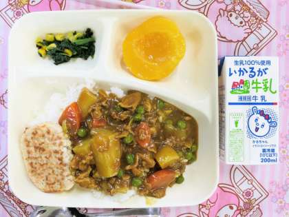 とうふハンバーグは、加工済みの食材で、焼き物機で焼き上げられ、配食時に盛り付けたカレーライスに添えられて、一緒にいただきました。