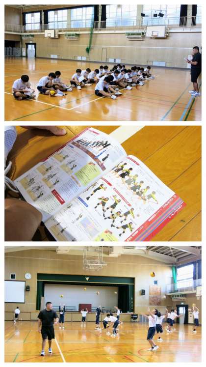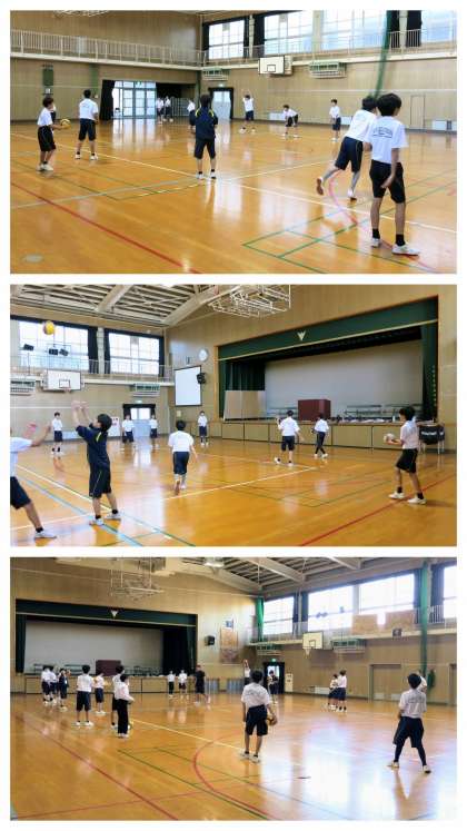 1年生の男子体育の学習の様子です。体育館でバレーボールに挑戦です。小学校の体育では取り組んでいないようで、生徒たちはかなり手こずっていました。