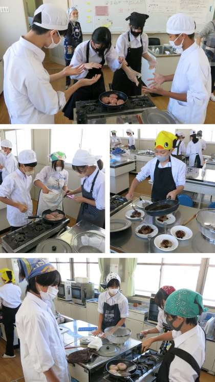 3〜4人のメンバーで、協力して、手際よく料理しました。玉ねぎのみじん切りも先生の説明を聞いて、担当の生徒が頑張ってカットしました。お麩の効果もあり、とってもふんわりしたハンバーグが出来上がり、授業時間の50分内に、最後はコンロ周りまでの掃除・片付けも含めて終えることができました。