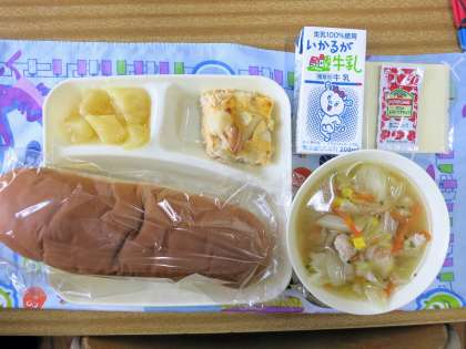 ツナポテトオムレツは、溶き卵に塩コショウで下味を付け、湯がいたじゃがいもとツナとともにパットに流し入れ、焼き物機で蒸し焼きされていました。ツナがたくさん入った、スペイン風オムレツのようです。ケッチャプの小袋も付いていておいしくいただきました。