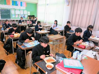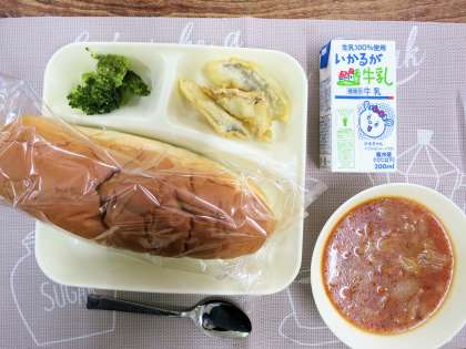 白身魚のフリッターは、冷凍の加工品を菜種油で衣がカリッと揚げられていました。「フリッター」とは、小麦粉や泡立てた卵白などで作った衣を付けて油で揚げたものです。ふっくらと仕上がるのが特徴で、今日の給食では「鱈(たら)」という魚を使用しています。