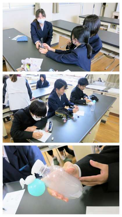 ペットボトルに少量の水を入れ、簡易の加圧器で栓をし、容器内の空気の圧力を大きくしていきます。その後、急激に栓を外して、容器内の気圧を小さくし、容器内に「白い煙」すなわち「雲」ができる様子を観察しました。