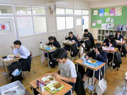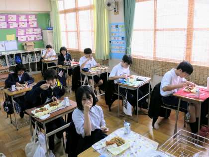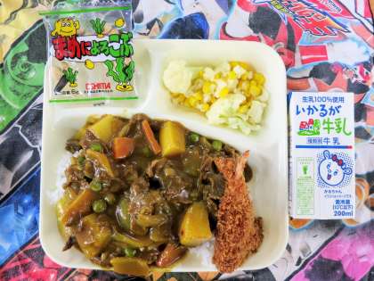エビフライカレーライスは、冷凍のエビフライを綿実油でカリッと揚げ、配食時にご飯に添えてカレーとともにいただきます。カレーは、薄切りの牛肉、玉ねぎ、じゃがいも、人参の定番お具材で、仕上げに彩りでグリーンピースも入っています。今回もアレルギー対応食で、カレールーの素は米粉で作られたものを使用しています。大人気のビーフカレーライスに、エビフライも付いていて、喜んでたくさん食べてくれていました。