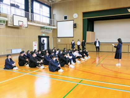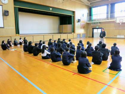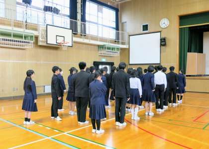 3年生は体育館で学年集会です。学年委員さんの号令で整列、出席確認、今週の反省、来週の目標、来週の予定が伝えられました。
