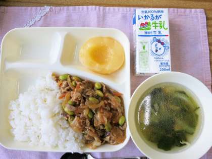 ピリ辛丼は、綿実油で豆板醤、にんにく、しょうがを香りよく炒め、豚肉、玉ねぎ、人参を炒めた後に湯を加えて、赤みそ、しょうゆ、こしょう、砂糖を合わせた調味液で味付けし、水溶きでん粉でとろみを付けて、最後にむき枝豆が加えられています。配食時にご飯の上にかけていただきました。