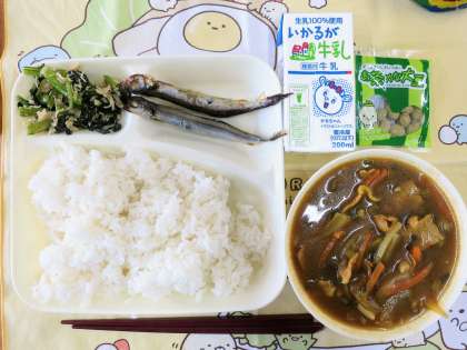 焼きししゃもは、みりんと料理酒で下味を付けて焼き物機で焼き上げられています。1人に2尾ずつの配膳です。しかしながら、苦手とする生徒も多く、頭やしっぽが付いているので苦手、おなかの部分が苦くて苦手、骨があるのも嫌、お家でもあまり食べないと、言っていました。カルシウムもたっぷりで、おなかの卵もおいしいのですが・・・。