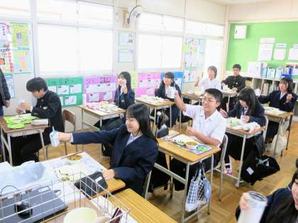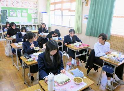 和風カレー汁は、昆布と削り節の合わせ出汁で、薄切りの豚肉、大根、人参、玉ねぎ、しめじ、青ネギが具材のカレールウの素が加えられた汁ものでした。生徒からは、中に「うどん」が入っていてもうれしかったね、という声もありました。