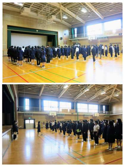 インフルエンザが警報級の猛威を振るっていますが、柴中生は今のところ大事には至っていません。予鈴の25分には体育館に集合し、生徒会による集合・整列、出席確認の後、あいさつ、今週の予定が伝えられました。