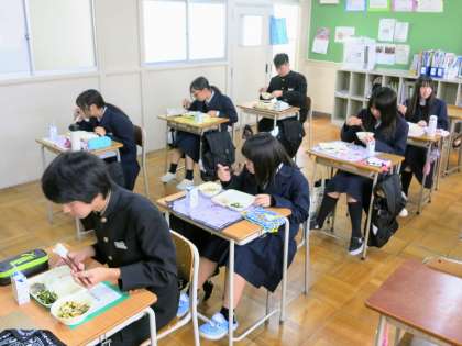 小松菜の煮浸しは、昆布と削り節の合わせ出汁で、鶏肉を煮て、砂糖としょうゆで味付けをし、最後に下茹でをした小松菜を加えて煮てあります。