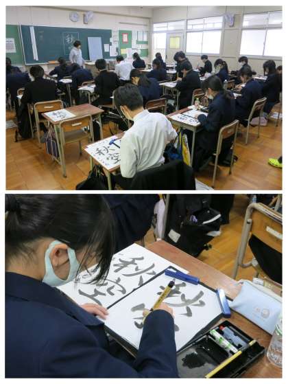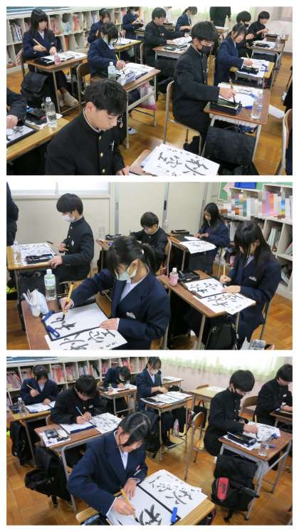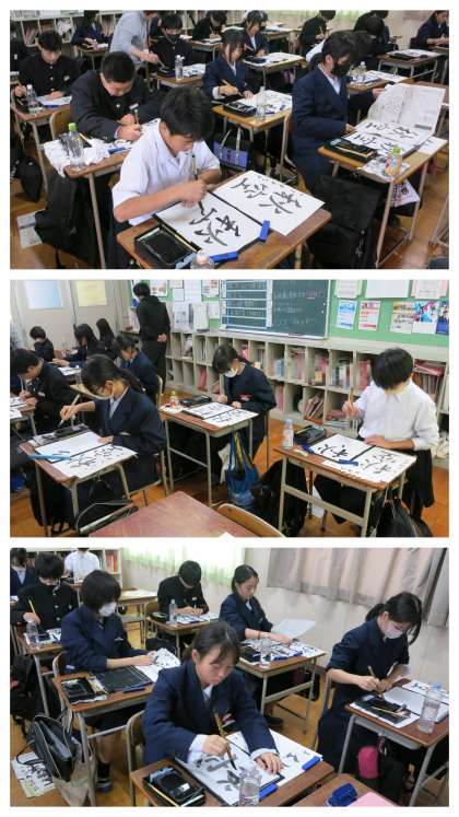今日は2回目の学習ということで、前回の自身の課題・修正点を振り返りながらの練習でした。先生のお手本を「払い」「はね」「止め」など、細かく見ながら、姿勢よく、指先に集中して書いていました。次回が清書の日となるようです。