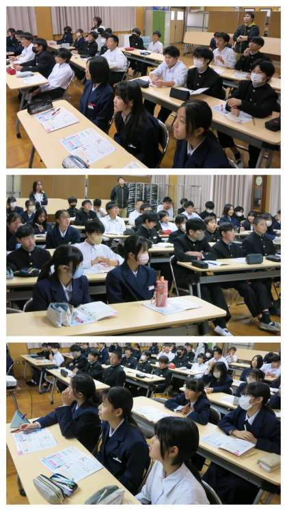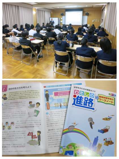 1年生は5時間目に多目的室で「進路学習」に取り組みました。今日が1回目の学習で、「進路学習用のテキスト」を用いながら、今後の「職場訪問」や「職場体験」につながるよう、学習を進めていきます。