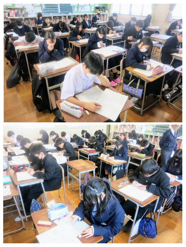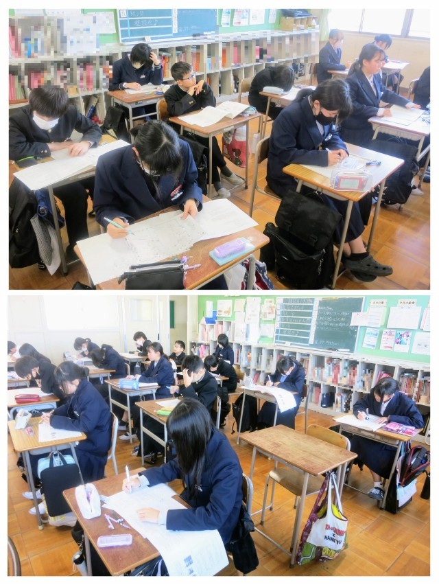 1年生の数学の学習の様子です。1年生の数学も2学期までの学習予定範囲が終わり、今日は、年明けの「チャレンジテスト」対策として、昨年度の問題に挑戦していました。