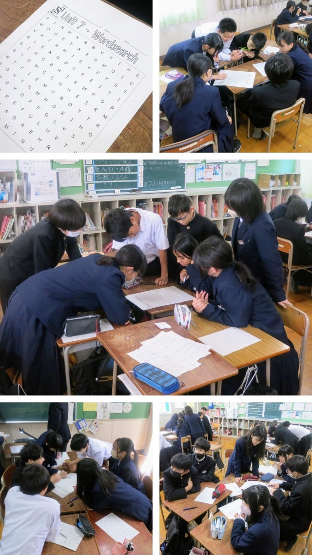 後半は、「Wordsearch」です。ワークシート一面にアルファベットが敷き詰められており、その中にはUnit7とUnit8で学習したWord(単語)が隠されています。班で協力して、縦・横・斜め・逆順など、みんなの知恵を結集して探していきます。見つかれば前に出て答え合わせをして、正解ならば得点をゲットです。