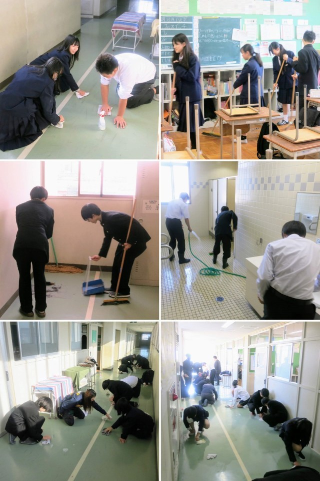 約30分間、普段の教室、廊下、階段、トイレなどの掃除に加え、机やいすの脚の裏のごみ取り、扇風機の解体清掃、黒板や窓枠の上や溝、廊下の汚れ取り、ロッカー内の雑巾がけなど、先生も一緒に、生徒全員で、心を込めて、自分たちの学習環境を清掃しました。