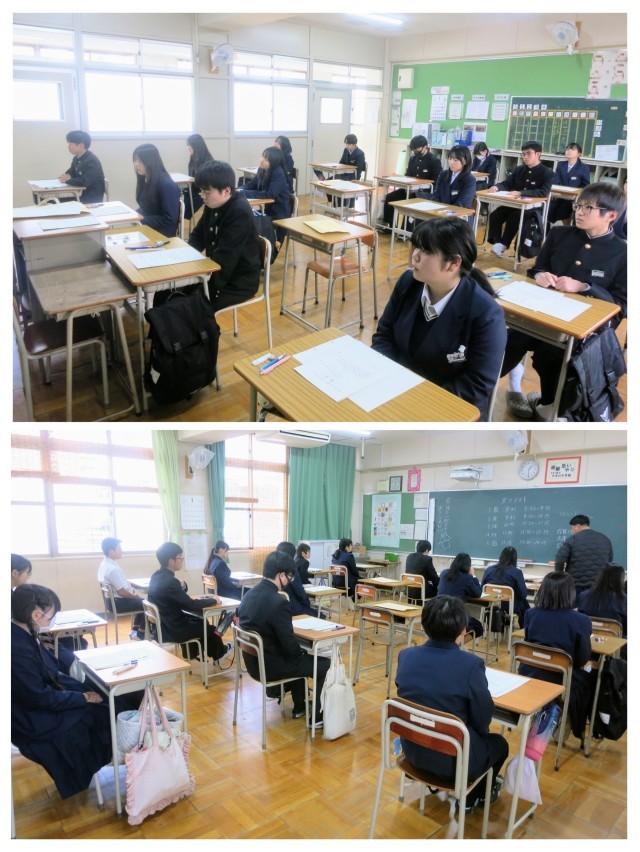 写真はラストの5時限目の国語のテストの様子です。朝から続いたテストもあと1教科です。最後まで、緊張・集中の顔つきです。