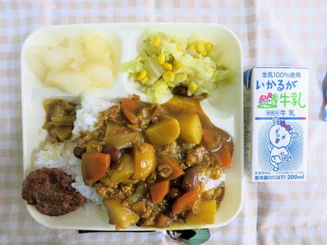 今日は大人気メニューのカレーライスにハンバーグも付いて大喜びです。大盛りでたくさん食べてくれました。