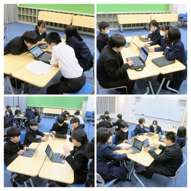 その後、1年生、2年生2チーム、3年生に分かれて、「Canva」を使って、校則を再確認するためのポスターの制作を行いました。完成後は、全校朝礼で披露し、校内に掲示予定です。