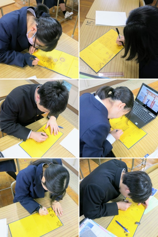 3年生の美術の学習の様子です。3学期の当初に紹介した、金屏風(四曲)を台紙にした「点描」の続報です。