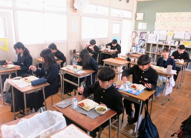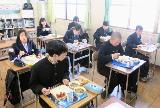 ヤンニョムチキンですが、「ヤンニョム」は甘辛いタレのことを言うそうです。一口大のの鶏肉をしょうが汁、にんにく、料理酒で下味した後、でん粉を付けて菜種油でカリッと揚げ、みりん、しょうゆ、ケチャップ、辛みの素のコチジャン、湯を加えて作ったタレで配缶時に絡めます。普段の「鳥から」にひと手間加わっていて大人気で、急遽な3年生の休業のためかたくさん配食されていて、多くの生徒が追加・お替りを喜んでいました。