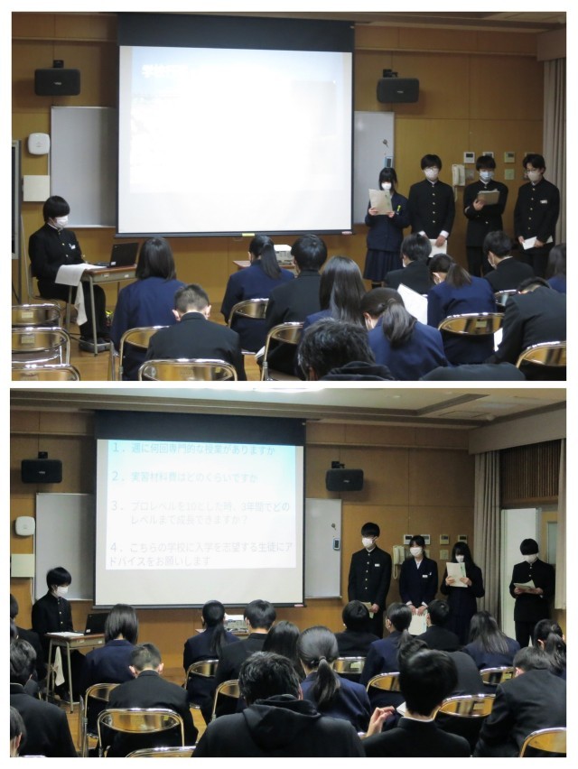2年生は5・6時間目に多目的室で、先月の1月29日(水)に実施しました「大阪体験学習」の発表会を行いました。当日は班別の行動で、午前中に高等学校や高等専修学校、午後は大阪市内の公共施設を訪問しました。