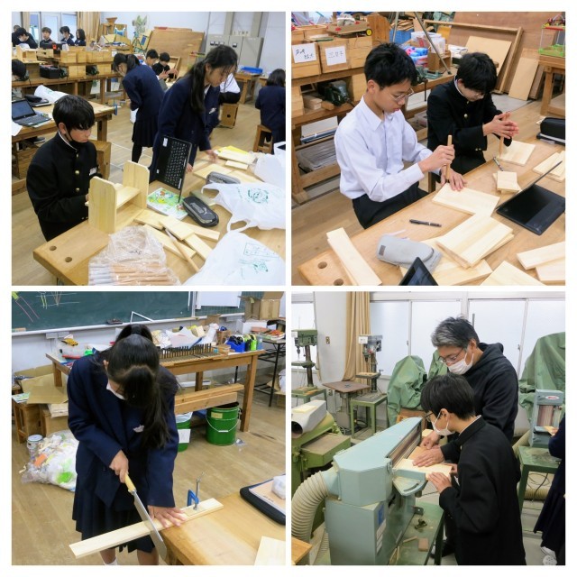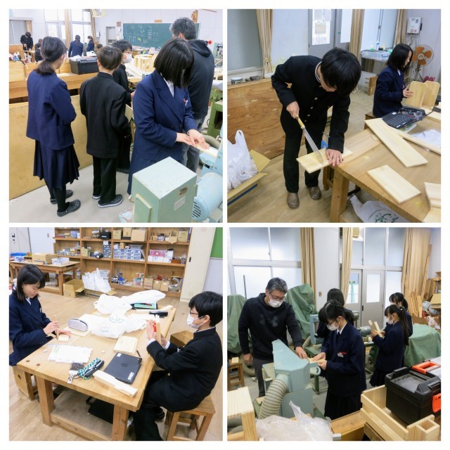 1年生の技術の学習の様子です。3学期に入り、一度報告した木材を使用した制作実習の続きです。ブックスタンド、マルチラック、飾り棚、スパイスラック、マガジンボックスなどの作品例より、お家で使用する身の回りで整理するものを制作しています。