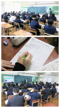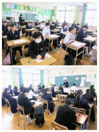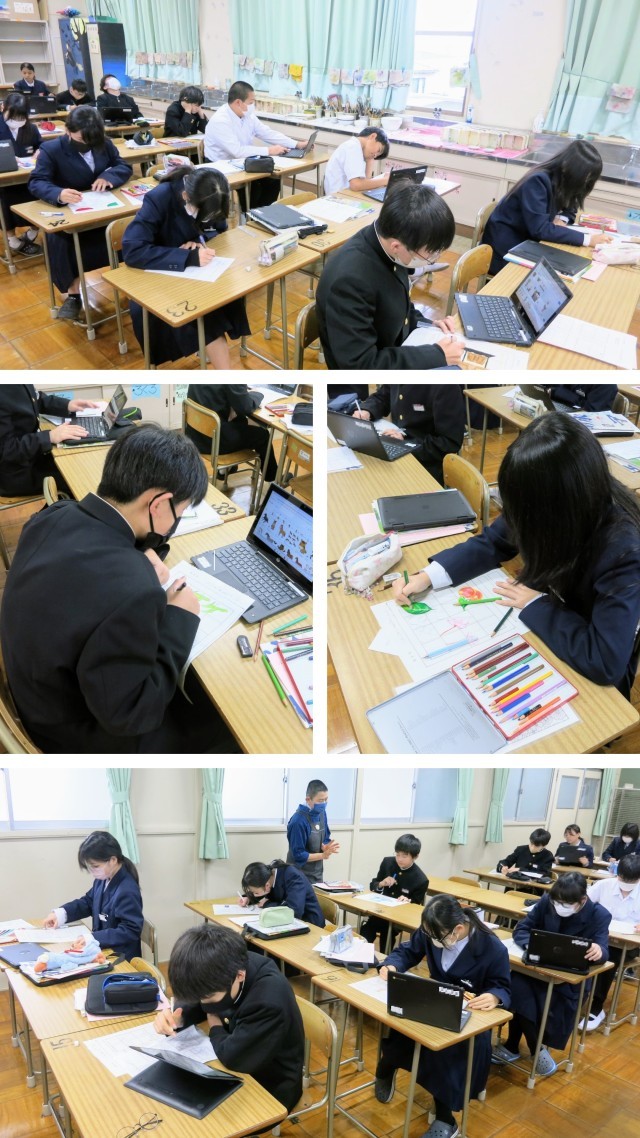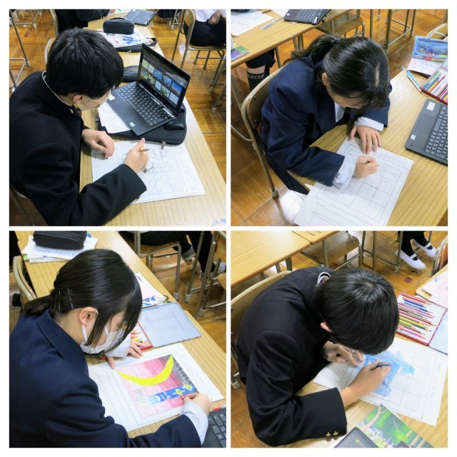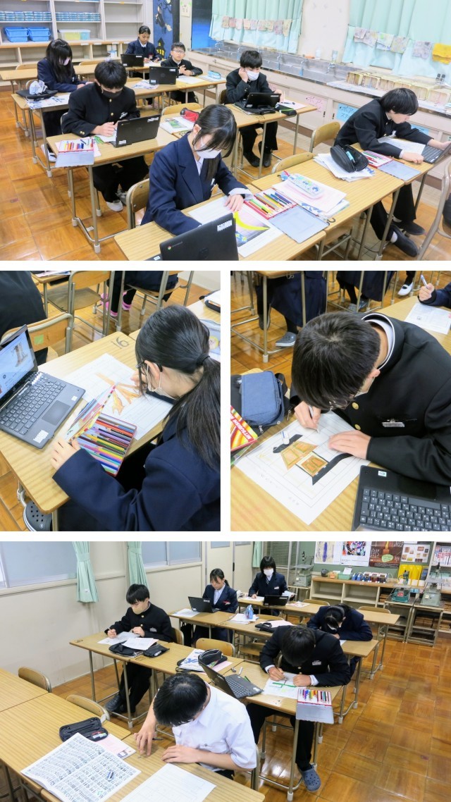1年生の美術の学習の様子です。1月の後半に紹介をした「文字が生み出すイメージ」として「絵文字」に取り組んでいます。