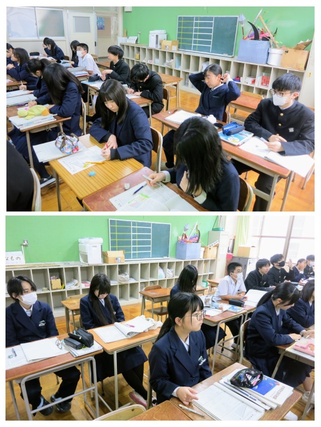 授業も、どの教科でも最終の、本当に最終のテスト対策となっています。写真は、3年生の社会の学習の様子です。