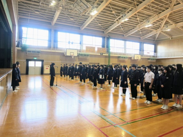 校長先生からは、2つのお話をしました。1つ目は「卒業式」についてです。中学校における最重要な儀式、行事です。3年生一人ひとりが主役です。3年間の学びや成長を、凛々しく堂々と表現してください。また、1・2年生も先輩たちの式を素晴らしい、感動する式にすべく、所作、気持ちを込めて臨席してください。