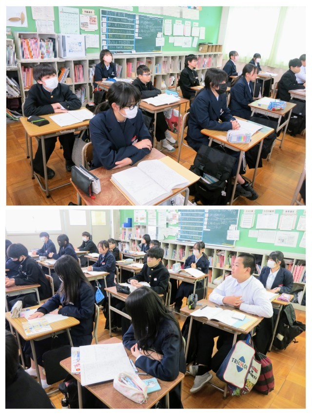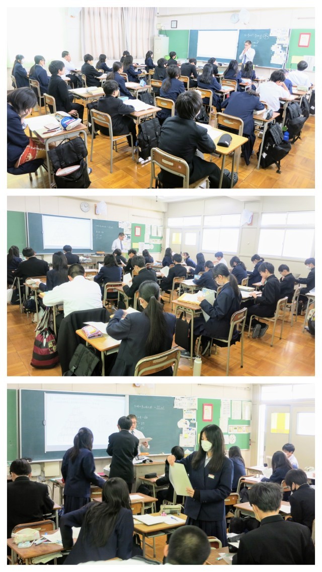 1年生の数学の学習の様子です。今日は、先週に実施した「学年末テスト」のテスト返却ラッシュです。このクラスでは1時間目から英語、理科のテストがすでに返却されているようで、数学で3教科目でした。