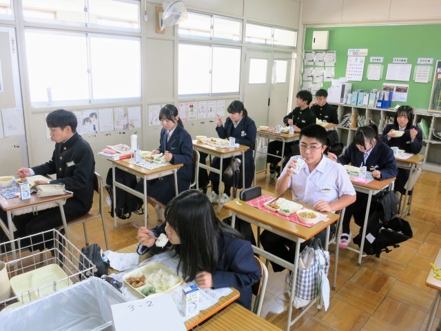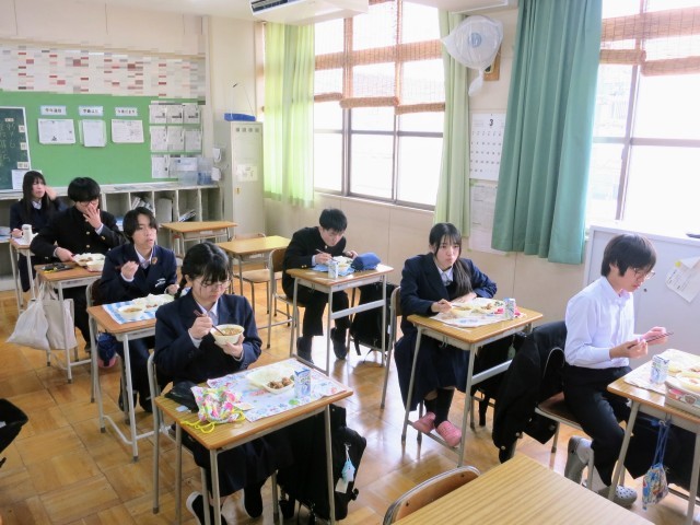 豚肉の竜田揚げは、一口大の豚肉にしょうが汁、しょうゆ、料理酒で下味を付けた後、でん粉をまぶし、菜種油でカラッと揚げられていました。生徒たちには大人気で、お替わりに多くの手が挙がっていました。